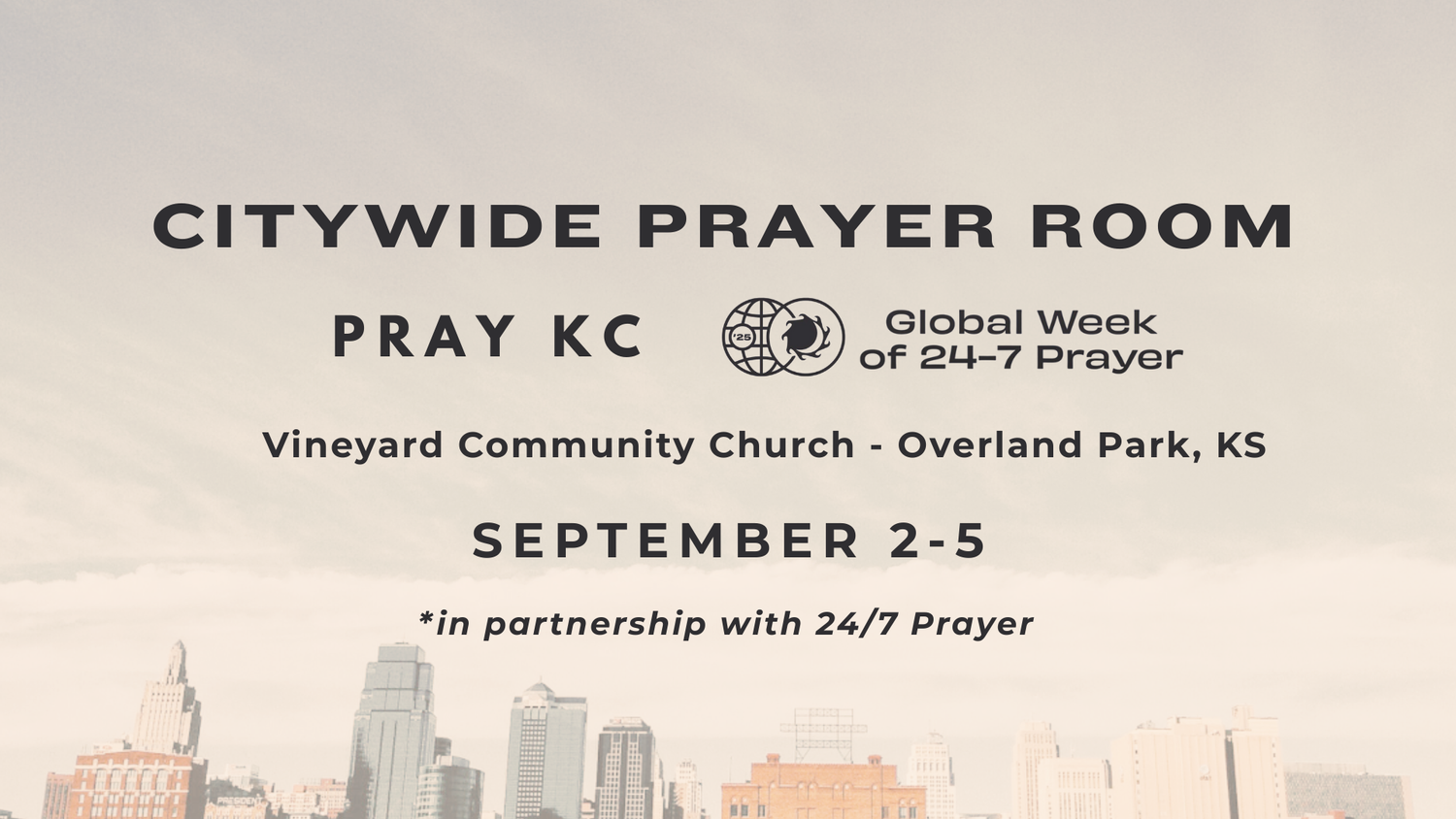 PrayKC and 24- Prayer Global week of Prayer are hosting a Citywide Prayer Room at Vineyard Community Church from Sept 2-5th. Register for an hour to pray for our city. No cost just come ready to experience God's presence and intercede for our city and world.